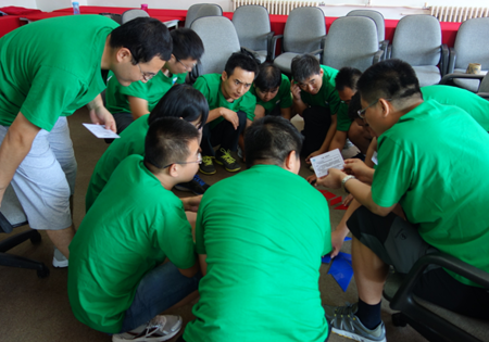 拓展活動(dòng)中參訓(xùn)家人分成兩只PK隊(duì)伍,通過(guò)組建團(tuán)隊(duì)、設(shè)定隊(duì)名、選隊(duì)長(zhǎng)、畫(huà)LOGO、喊隊(duì)訓(xùn),大家迅速形成團(tuán)隊(duì)榮譽(yù)感,在接下來(lái)的齊眉棍、七巧板、數(shù)碼風(fēng)暴、野外CS等活動(dòng)中,兩只隊(duì)伍實(shí)力不相上下,各有千秋。