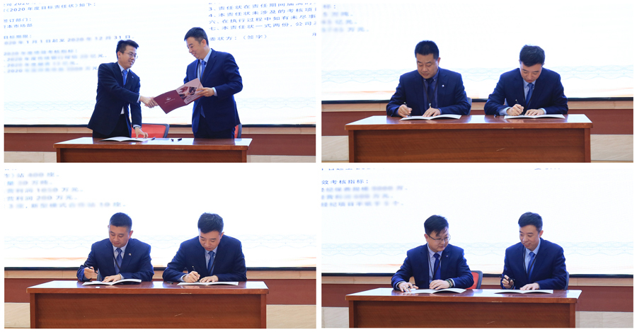 為了確保完成全年工作目標(biāo),統(tǒng)一思想認(rèn)識,理清工作思路,明確責(zé)任目標(biāo),財(cái)務(wù)風(fēng)控部總監(jiān)李作江、能化產(chǎn)品經(jīng)營部負(fù)責(zé)人李建強(qiáng)、加盟合作事業(yè)部總經(jīng)理趙振峰、融泰保險(xiǎn)經(jīng)紀(jì)總經(jīng)理劉龍分別與山東石化董事長兼總經(jīng)理祝偉簽訂2020年責(zé)任狀。